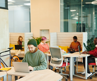 Flexible hot desks and dedicated workstations in a collaborative environment.
